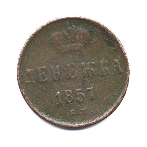 Монета регулярного выпуска «Денежка (1/2 копейки) 1857 года» 1855-1881 (Александр II) (Российская Империя) Монетный двор: Екатеринбургская монета, Екатеринбург, Вензель А II Медь