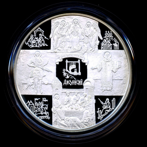 Юбилейная монета: 100 рублей 2002 года «Историческая серия. Дионисий». Дионисий. Российская Федерация: Россия современная (1997 — 2020). Монетный двор: Санкт-Петербургский монетный Двор. Серебро 900, 1 111 г, ø 100 мм, Гурт: Рубчатый. Каталожный номер: 5117−0023. Тираж: 500 шт. Серия: Историческая серия: Дионисий.