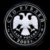 в центре диска — эмблема Банка России (двуглавый орел с опущенными крыльями, под ним надпись полукругом «БАНК РОССИИ»), обрамленная кругом из точек и надписями по кругу: вверху — «СТО РУБЛЕЙ», внизу — «2002 г.», слева — обозначение металла, проба сплава, справа — содержание драгоценного металла в чистоте и товарный знак монетного двора.Реверс