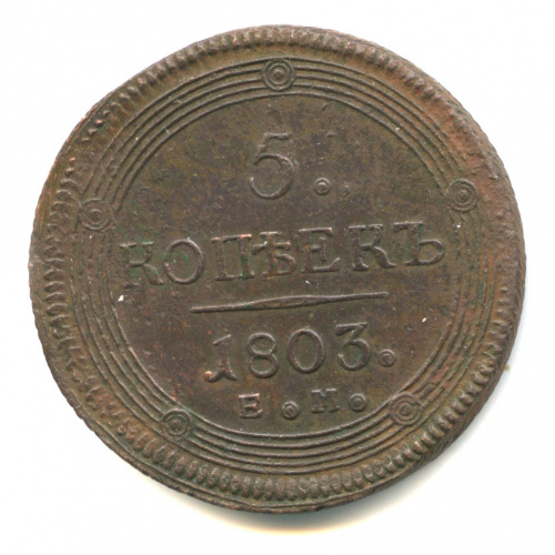 5 копеек — Кольцевик. Орел 2 типа: на аверсе точка с 2 ободками, корона большая. 1803 ЕМ. Корона над орденом Андрея Первозванного особого начертания (…