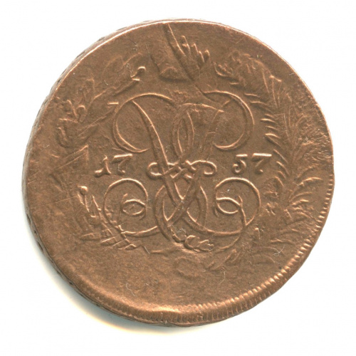 2 копейки — Вензель императрицы Елизаветы. Номинал под гербом. Гурт: сетка 1757. редкая в подобной сохранности - (Российская Империя)
