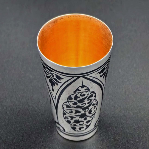 Стопка. Клейма 9КХК, звезда 925. Высота 5,9 см., общий вес 32,2 гр. Кубачинский художественный комбинат. Чернение, позолота. Состояние отличное (СССР)