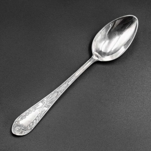 Ложка десертная. Германские клейма — 800. Клейма СССР — КЮФ, 800 голова рабочего. Прошла перепробировку на Киевской ювелирной фабрике. Длина 15,5 см.,…