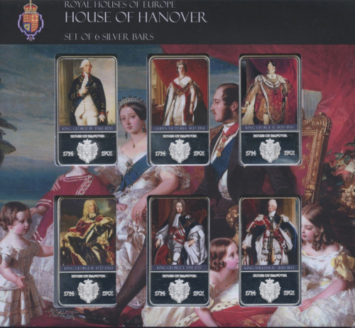 Набор из 6-ти монет «20 долларов — Королевские дома Европы. Дом в Ганновере». Серебро 999 пробы. В цвете. Размер 50×28 мм. Тираж 5000 экз. 6 монет в к…