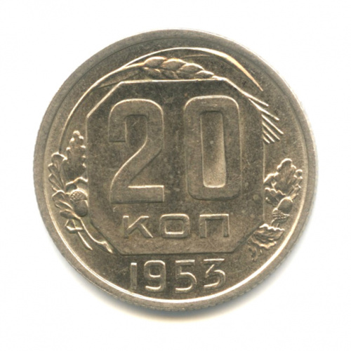 20 копеек — Венок 16 лент. Р приспущена 1953. л/с — шт.3, буква «Р» приспущена от герба, Федорин-96, оценка по каталогу Федорина = 100 у.е., Тилижинск…