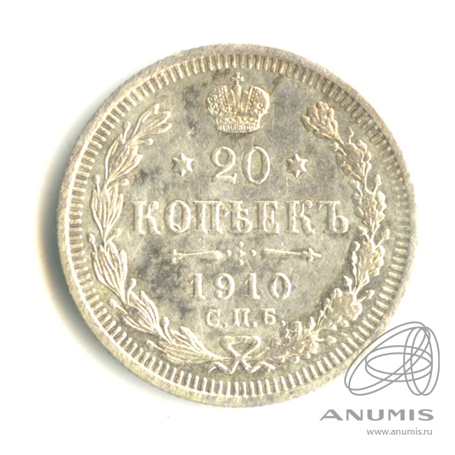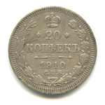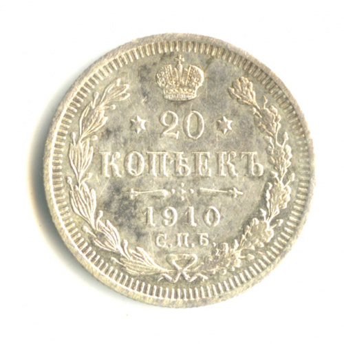 Монета регулярного выпуска: 20 копеек 1910 года «Орел 4 типа». 20 копеек 1859 — 1917 гг. Российская Империя: Николай II (1894 — 1917). Монетный двор: Санкт-Петербургский монетный двор, г. Санкт-Петербург. Минцмейстер: Эликум Иванович Бабаянц (1906−1913). Серебро 500, 4 г, ø 22 мм, Гурт: Рубчатый. Тираж: 11000009 шт.