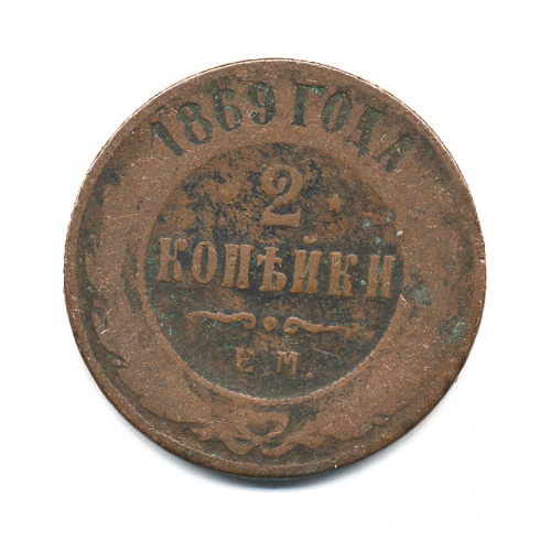 Монета регулярного выпуска «2 копейки 1869 года» 1855-1881 (Александр II) (Российская Империя) Монетный двор: Екатеринбургская монета, Екатеринбург Медь