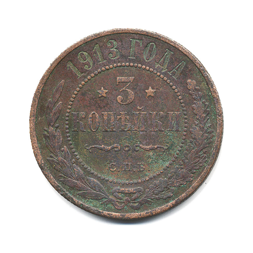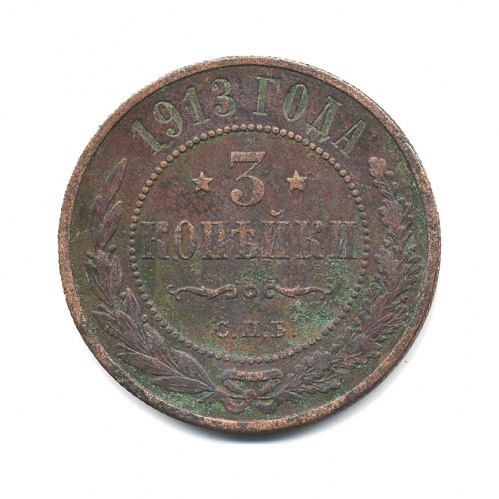 Монета регулярного выпуска «3 копейки 1913 года» 1895-1917 (Николай II) (Российская Империя) Монетный двор: Санкт-Петербургский монетный двор, Санкт-Петербург Медь