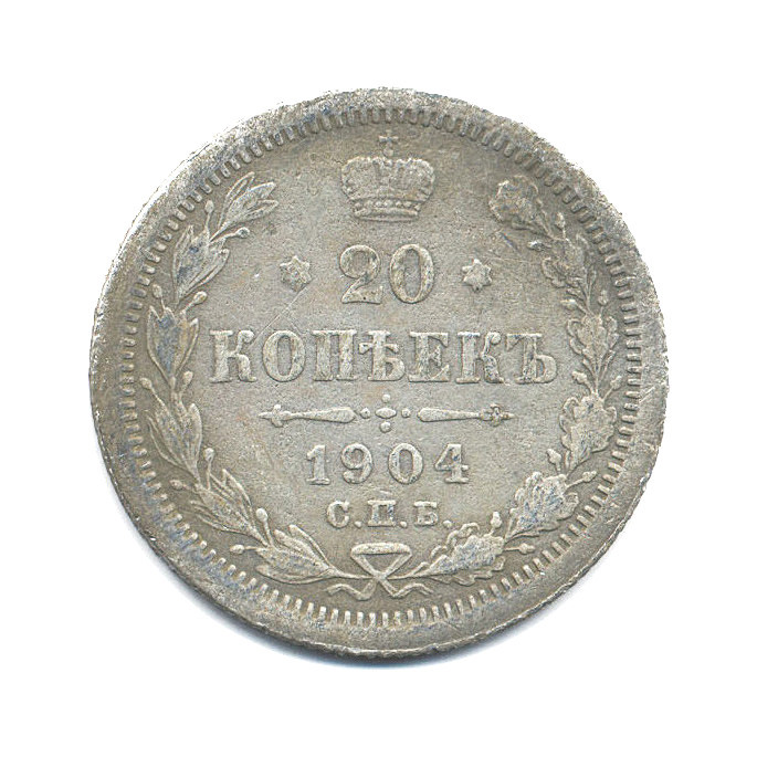 Монета регулярного выпуска «20 копеек 1904 года» 1895-1917 (Николай II) (Российская Империя) Монетный двор: Санкт-Петербургский монетный двор, Санкт-Петербург, Минцмейстер: Александр РЕДЬКО Серебро 0.500