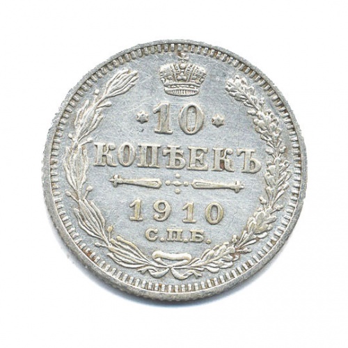 Монета регулярного выпуска «10 копеек 1910 года» 1895-1917 (Николай II) (Российская Империя) Монетный двор: Санкт-Петербургский монетный двор, Санкт-Петербург, Минцмейтер: Эликум БАБАЯНЦ Серебро 0.500