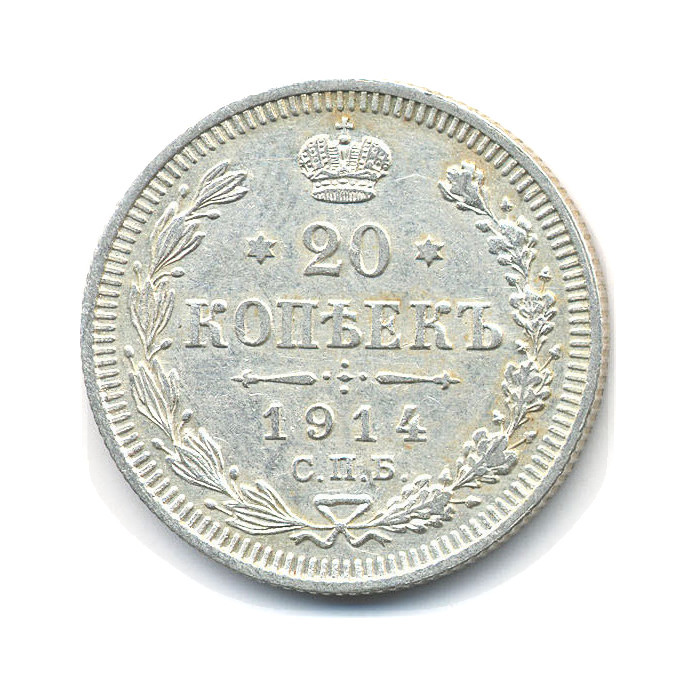 Монета регулярного выпуска «20 копеек 1914 года» 1895-1917 (Николай II) (Российская Империя) Монетный двор: Санкт-Петербургский монетный двор, Санкт-Петербург, Минцмейстер: Виктор Смирнов Серебро 0.500
