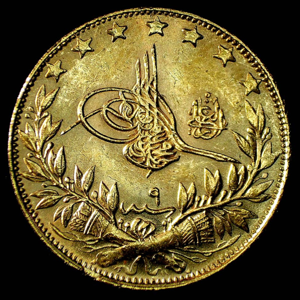 100 курушей (Регулярный выпуск) Мухаммад V. Девятый год правления (1917 г.) 1909. Штемпельный блеск (Османская империя)