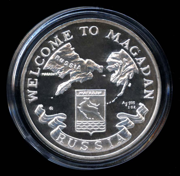 Медаль настольная «Магаданская золото-серебрянная компания». ⌀ 39. ММД. 1 унция. 900 проба серебра (Россия)