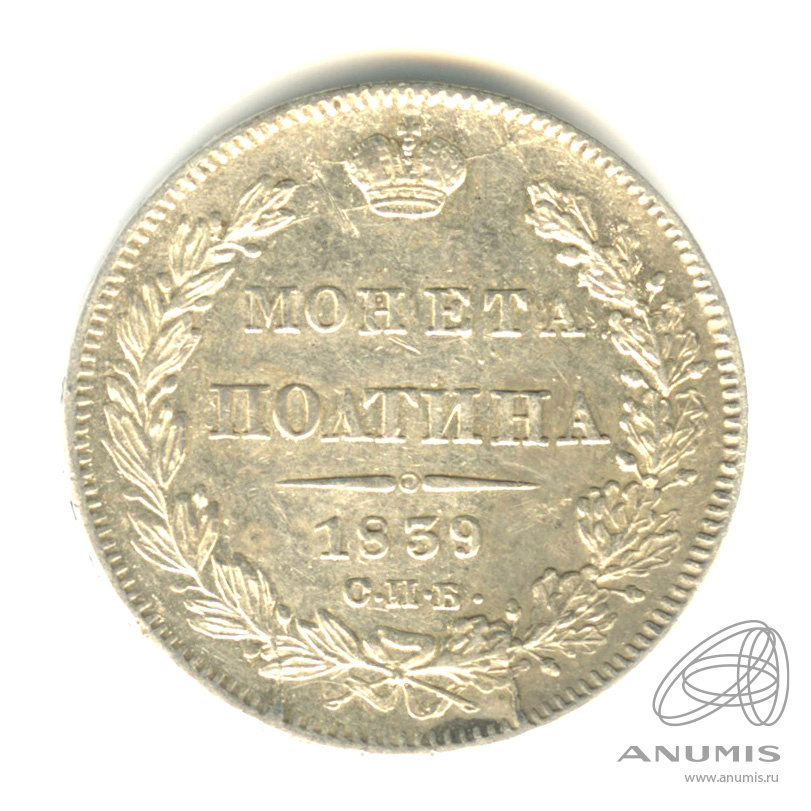 В центре указан номинал «МОНЕТА ПОЛТИНА» в две строки. Над номиналом — Корона Российской империи. Под номиналом расположен декоративный разделитель в виде двух разнонаправленных фигурных линий и небольшой окружности между ними, в центре которой, выпуклая точка. Под разделителем — дата выпуска монеты «1839». Под цифрой даты — обозначение монетного двора «С.П.Б.». Вдоль канта, не доходя до короны, изображен венок из лавровой и дубовой ветви, которые в нижней части перевязаны лентой на узел бантом. По окружности канта имеются рельефные элементы, выполненные в виде зубцов.