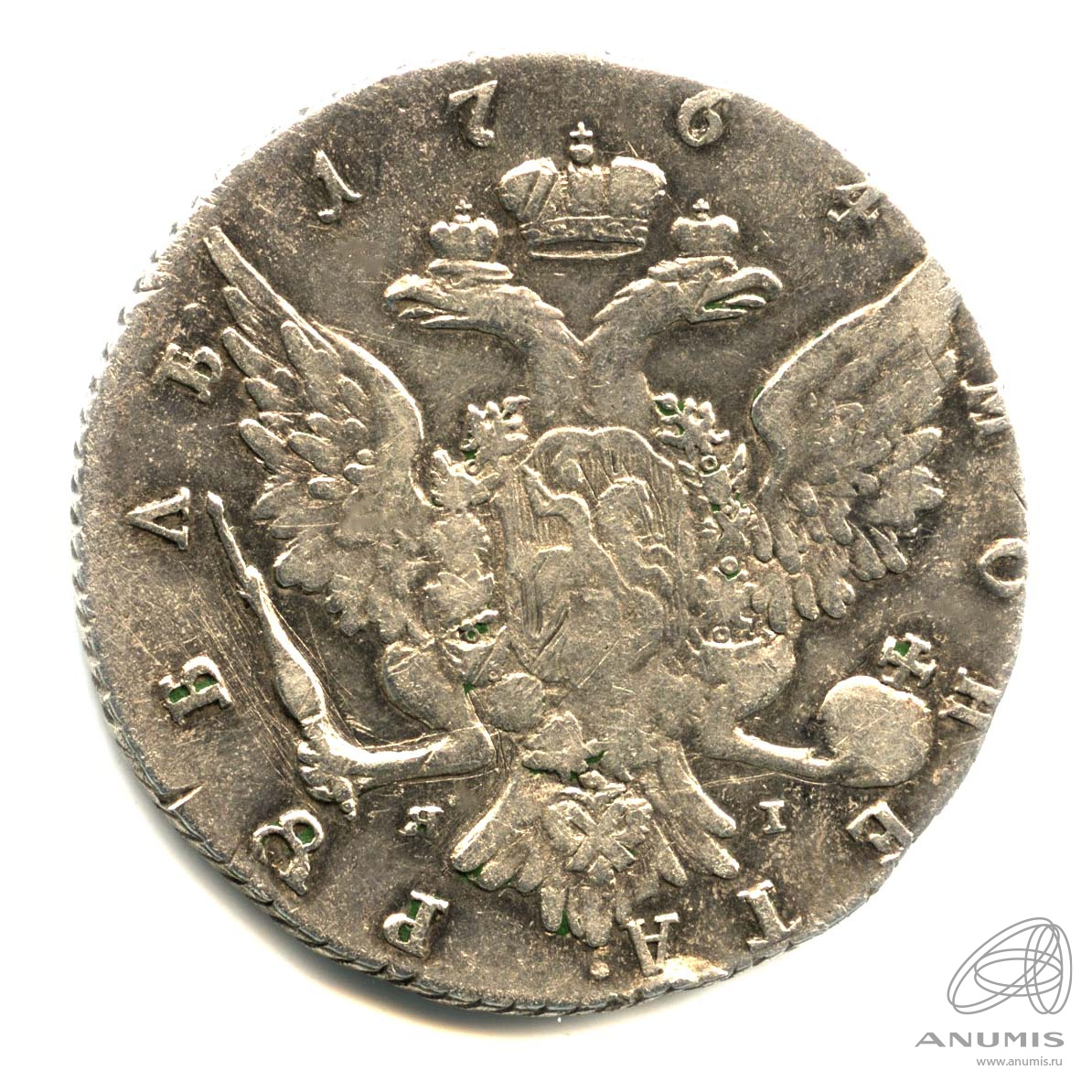Монета регулярного выпуска: 1 рубль 1764 года «Портрет Екатерины II. С шарфом на шее». 1 рубль 1762 — 1776 гг. Российская Империя: Екатерина II (1762 — 1796). Монетный двор: Санкт-Петербургский монетный двор, г. Санкт-Петербург. Минцмейстер: Яков Иванов (1752−1766). Гравер: Тимофей Иванов. Серебро 750, 24 г, ø 38−39 мм, Гурт: Шнур. Тираж: 3016452 шт.