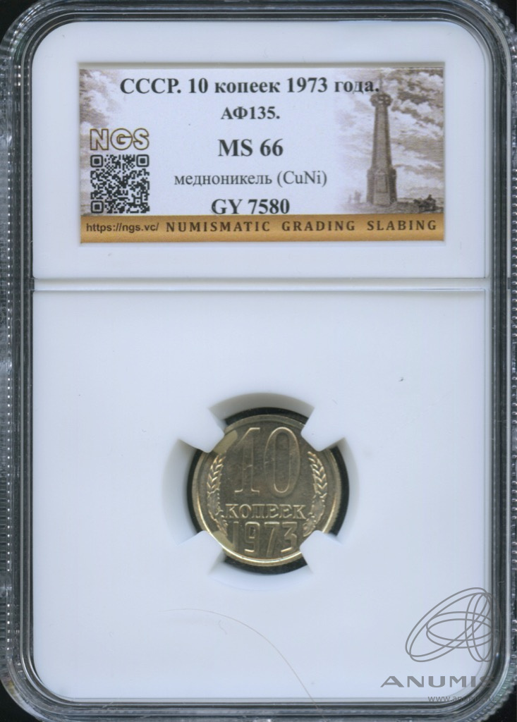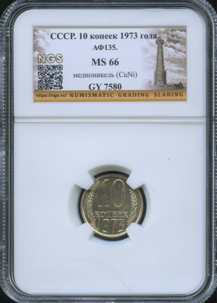 Монета регулярного выпуска: 10 копеек 1973 года. 10 копеек 1961 — 1991 гг. Союз Советских Социалистических Республик: СССР поздний (1961 — 1991). Медь-никель, 2 г, ø 17 мм, Гурт: Рубчатый.