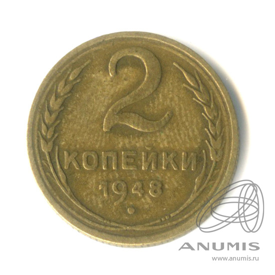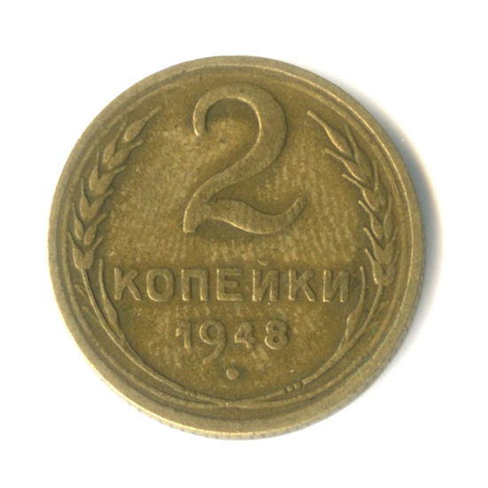 Монета регулярного выпуска: 2 копейки 1948 года «Венок 16 лент». 2 копейки 1947 — 1957 гг. Союз Советских Социалистических Республик: СССР ранний (1924 — 1958). Бронза, 2 г, ø 18 мм, Гурт: Рубчатый.