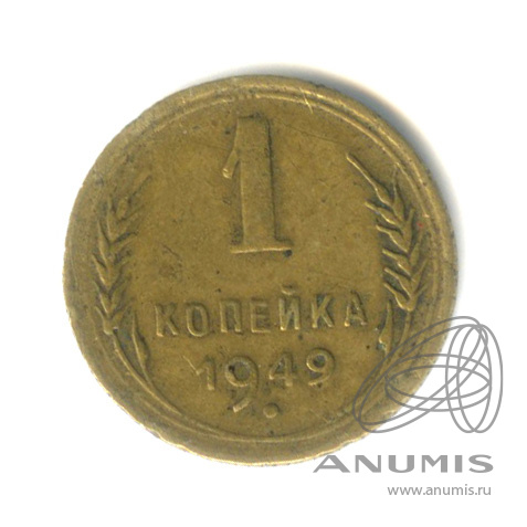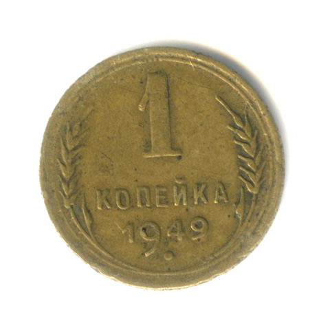 Монета регулярного выпуска: 1 копейка 1949 года «Венок 16 лент». 1 копейка 1947 — 1957 гг. Союз Советских Социалистических Республик: СССР ранний (1924 — 1958). Бронза, 1 г, ø 15 мм, Гурт: Рубчатый.