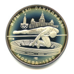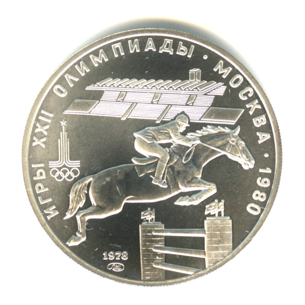 Юбилейная монета: 5 рублей 1978 года «Игры XXII Олимпиады. Конный спорт: преодолевание барьера на лошади (Конкур)». 5 рублей 1977 — 1980 гг. «Олимпиада 80». Союз Советских Социалистических Республик: СССР поздний (1961 — 1991). Серебро 900, 17 г, ø 33 мм, Гурт: Рубчатый. Тираж: 220603 шт. Серия: Спорт.