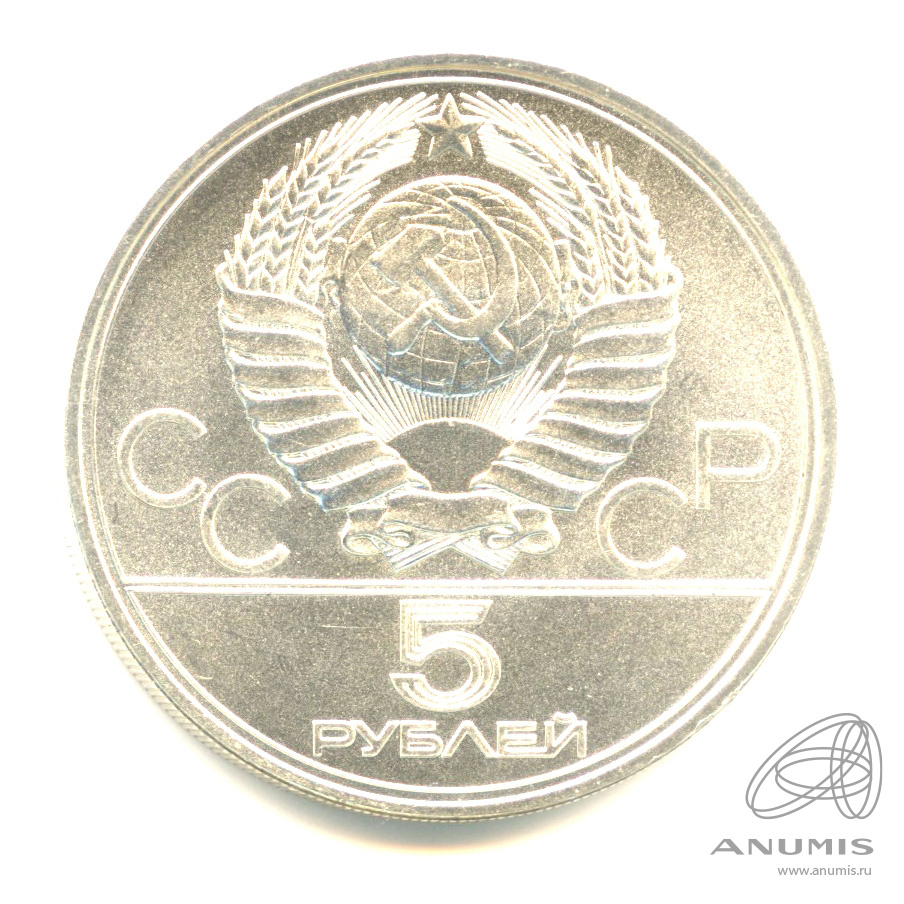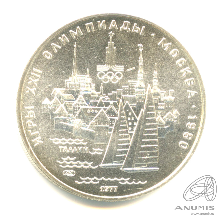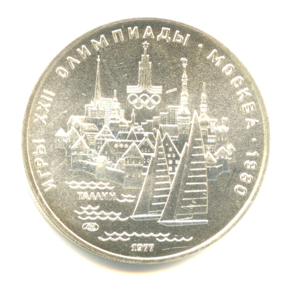 Юбилейная монета: 5 рублей 1977 года «Игры XXII Олимпиады. Таллин». 5 рублей 1977 — 1980 гг. «Олимпиада 80». Союз Советских Социалистических Республик: СССР поздний (1961 — 1991). Серебро 900, 17 г, ø 33 мм, Гурт: Рубчатый. Тираж: 251562 шт. Серия: Спорт.