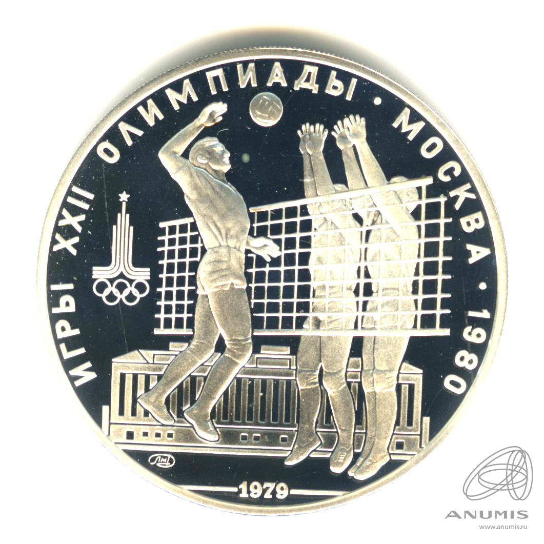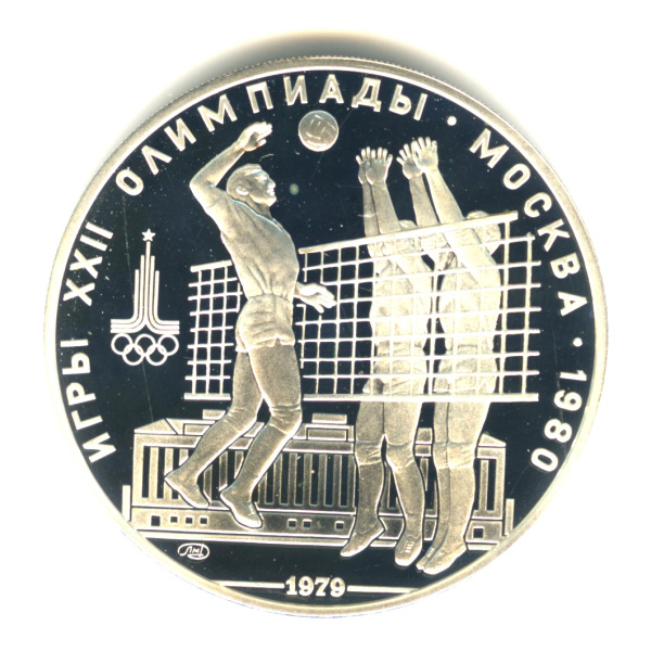 Юбилейная монета: 10 рублей 1979 года «Игры XXII Олимпиады. Волейбол». 10 рублей 1977 — 1980 гг. «Олимпиада 80». Союз Советских Социалистических Республик: СССР поздний (1961 — 1991). Серебро 900, 33 г, ø 39 мм, Гурт: Рубчатый. Тираж: 220583 шт. Серия: Спорт.