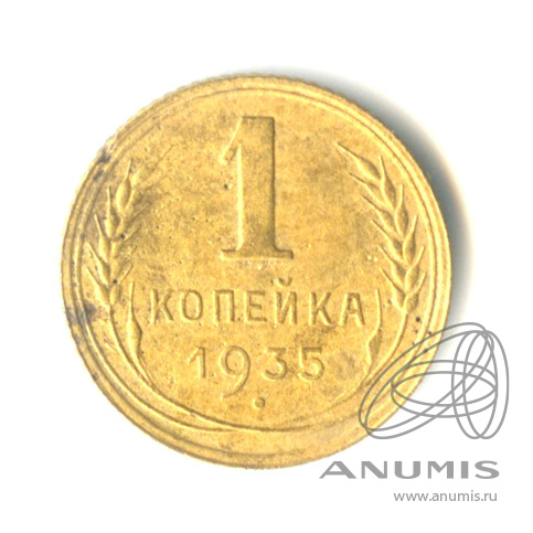Монета регулярного выпуска: 1 копейка 1935 года «Без круговой надписи. Венок 7 лент». 1 копейка 1935 — 1936 гг. Союз Советских Социалистических Республик: СССР ранний (1924 — 1958). Бронза, 1 г, ø 15 мм, Гурт: Рубчатый. Тираж: 66405000(ст.инов.тип) шт.