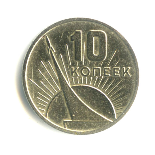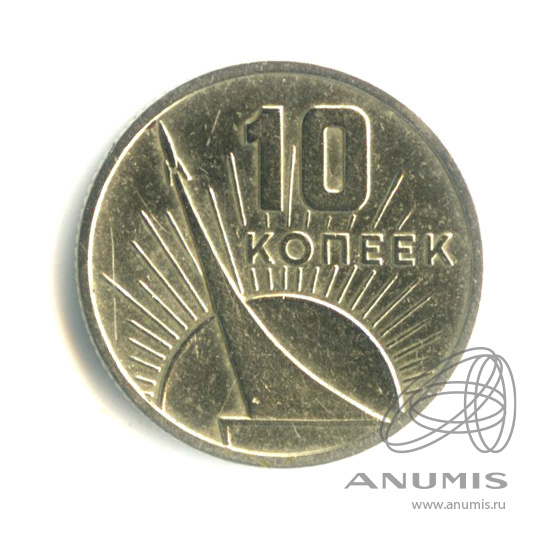 В верехней правой части диска обозначение достоинства монеты «10» и под ним слово «КОПЕЕК», в осталной части монетного поля изображение монумента «Покорителям космоса» и за ним восходящего солнца обрамленного расходящимися лучами.