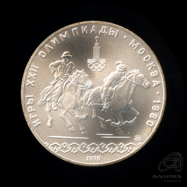Юбилейная монета: 10 рублей 1978 года «Игры XXII Олимпиады. Догони девушку (Конный спорт)». 10 рублей 1977 — 1980 гг. «Олимпиада 80». Союз Советских Социалистических Республик: СССР поздний (1961 — 1991). Монетный двор: Московский монетный двор, г. Москва. Серебро 900, 33 г, ø 39 мм, Гурт: Рубчатый. Тираж: 118409 шт. Серия: Спорт.