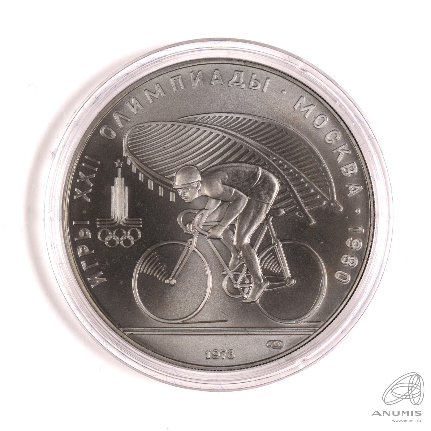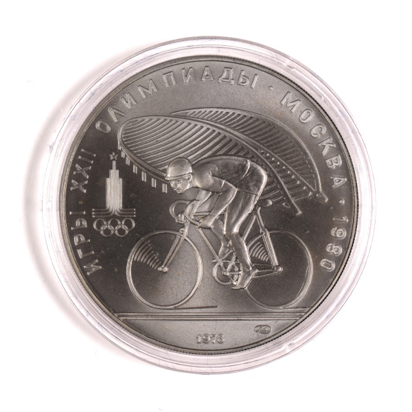 Юбилейная монета: 10 рублей 1978 года «Игры XXII Олимпиады. Велосипед (Велоспорт)». 10 рублей 1977 — 1980 гг. «Олимпиада 80». Союз Советских Социалистических Республик: СССР поздний (1961 — 1991). Серебро 900, 33 г, ø 39 мм, Гурт: Рубчатый. Тираж: 252724 шт. Серия: Спорт.