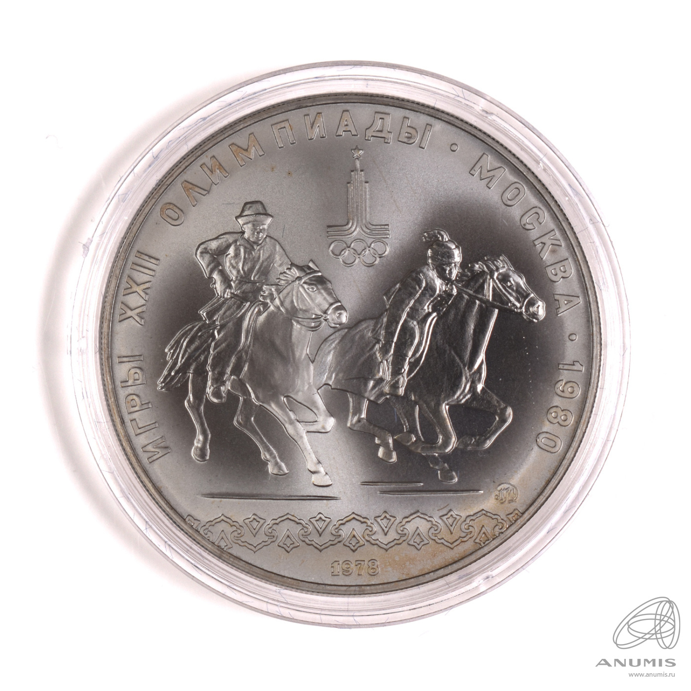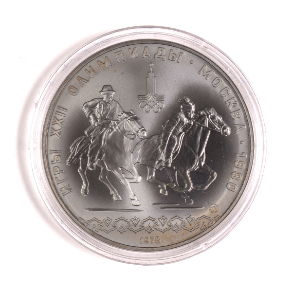 Юбилейная монета: 10 рублей 1978 года «Игры XXII Олимпиады. Догони девушку (Конный спорт)». 10 рублей 1977 — 1980 гг. «Олимпиада 80». Союз Советских Социалистических Республик: СССР поздний (1961 — 1991). Монетный двор: Московский монетный двор, г. Москва. Серебро 900, 33 г, ø 39 мм, Гурт: Рубчатый. Тираж: 118409 шт. Серия: Спорт.