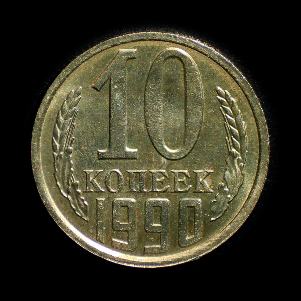 Монета регулярного выпуска: 10 копеек 1990 года. 10 копеек 1961 — 1991 гг. Союз Советских Социалистических Республик: СССР поздний (1961 — 1991). Медь-никель, 2 г, ø 17 мм, Гурт: Рубчатый.