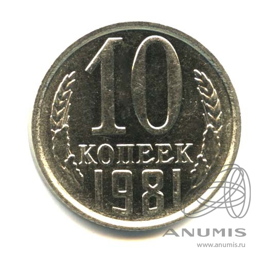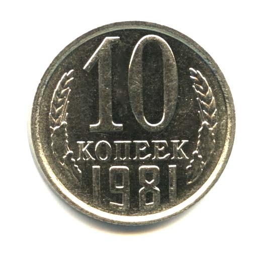 Монета регулярного выпуска: 10 копеек 1981 года. 10 копеек 1961 — 1991 гг. Союз Советских Социалистических Республик: СССР поздний (1961 — 1991). Медь-никель, 2 г, ø 17 мм, Гурт: Рубчатый.