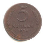 5 копеек — Гурт гладкий. На Николаевском кружке. Земной шар плоский 1924 СССР»» |