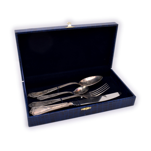 Набор столовых приборов: ложка, вилка, нож, чайная ложка. Серебро 925 пробы. 238,63 г. Футляр