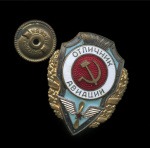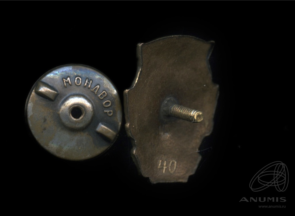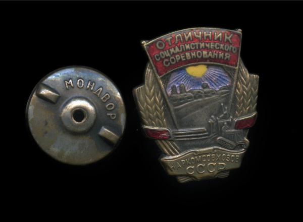 Знак «Отличиник социалистического соревнования Наркомсовхозов СССР». Крепление: винт. Тяжелый, эмаль. Знак бронзовый. Буквы МД и номер 40 добавлены не заводским способом