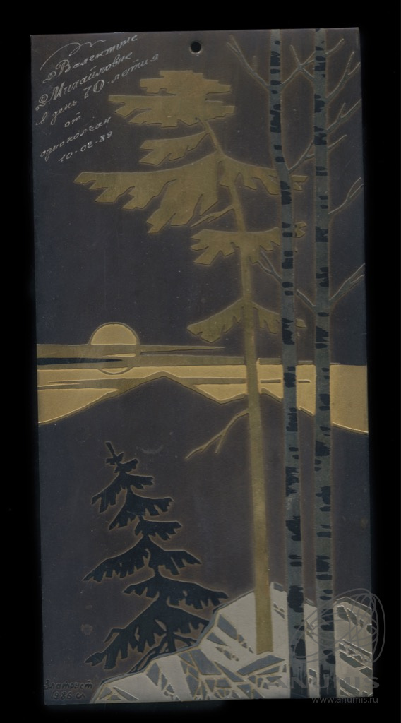 Панно с изображением пейзажа. С дарственной надписью от 1989 г. Размер 10,5×21 см