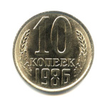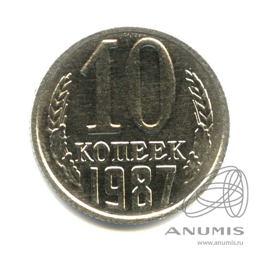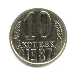 Монета регулярного выпуска: 10 копеек 1987 года. 10 копеек 1961 — 1991 гг. Союз Советских Социалистических Республик: СССР поздний (1961 — 1991). Медь-никель, 2 г, ø 17 мм, Гурт: Рубчатый.