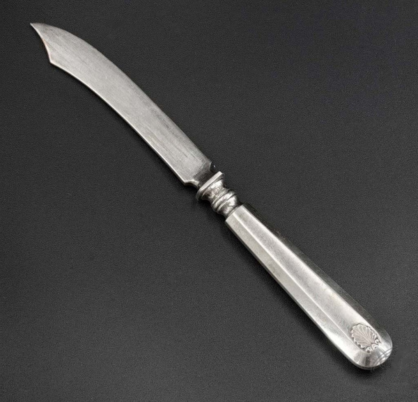 Нож для фруктов. Рукоять серебряная — 813, лезвие серебряное — 925. Длина 15,5 см., вес 41,5 гр. Клейма — корона в сердце 830 «А» город Турку. Гравиро…