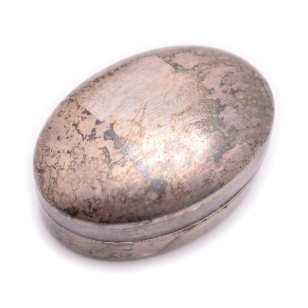 Шкатулка овальной формы. Серебро 800 пробы. Размер 5×3,3 см. 19 г. Инициалы AG