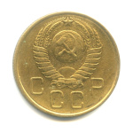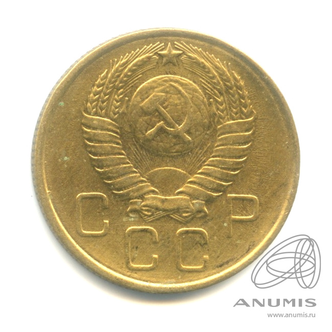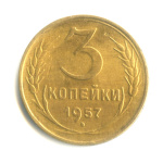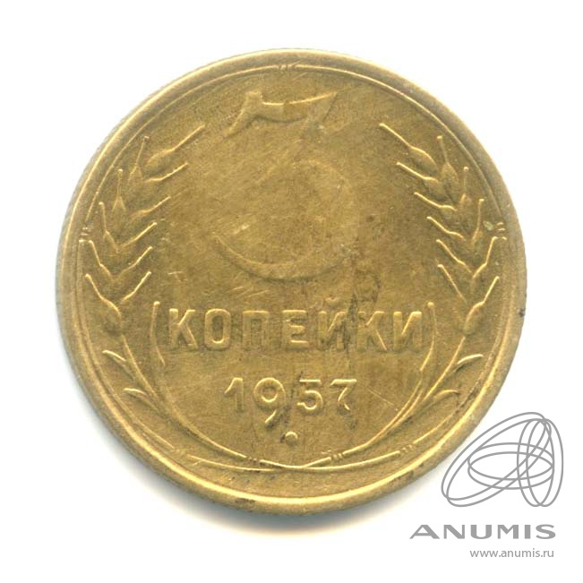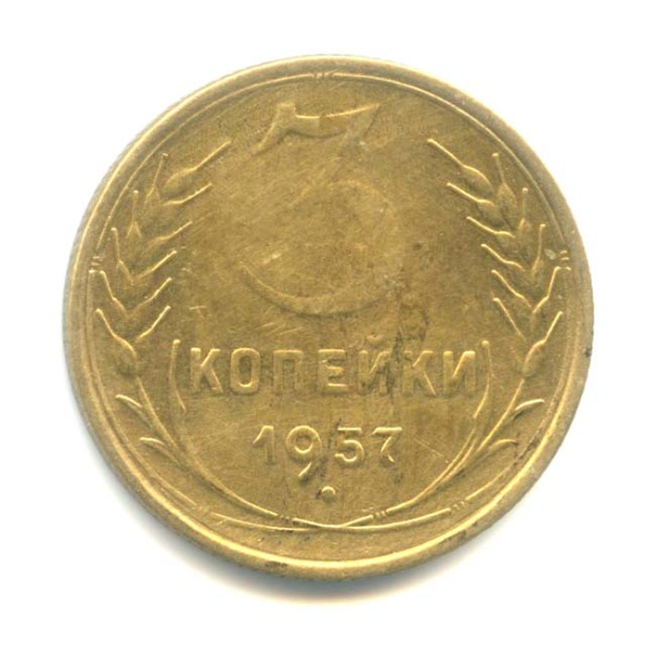 Монета регулярного выпуска: 3 копейки 1957 года «Венок 15 лент». 3 копейки 1947 — 1957 гг. Союз Советских Социалистических Республик: СССР ранний (1924 — 1958). Бронза, 3 г, ø 22 мм, Гурт: Рубчатый.