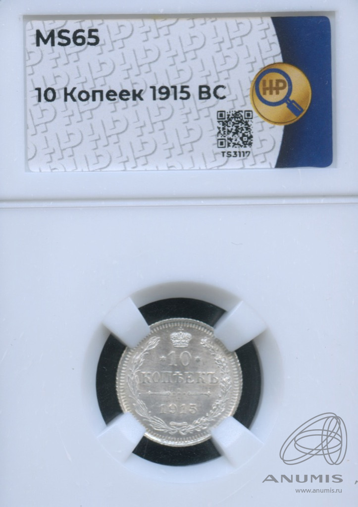 Монета регулярного выпуска: 10 копеек 1915 года «Орел нового типа». 10 копеек 1859 — 1917 гг. Российская Империя: Николай II (1894 — 1917). Минцмейстер: Виктор Петрович Смирнов (1912−1917). Серебро 500, 2 г, ø 18 мм, Гурт: Рубчатый. Тираж: 82500000 шт.