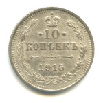 В центре указан номинал «10», ограниченный с обеих сторон звездочками. Над цифрой — Корона Российской империи. Под цифрой номинала — слово «КОПЕЕК». Ниже, расположен декоративный разделитель в виде двух разнонаправленных фигурных линий и стилизованным из точек крестом между ними. Под разделителем — дата выпуска монеты «1915». Вдоль канта, не доходя до короны, изображен венок из лавровой и дубовой ветви, которые в нижней части перевязаны лентой на узел бантом. По окружности канта имеются рельефные элементы, выполненные в виде зубцов.