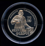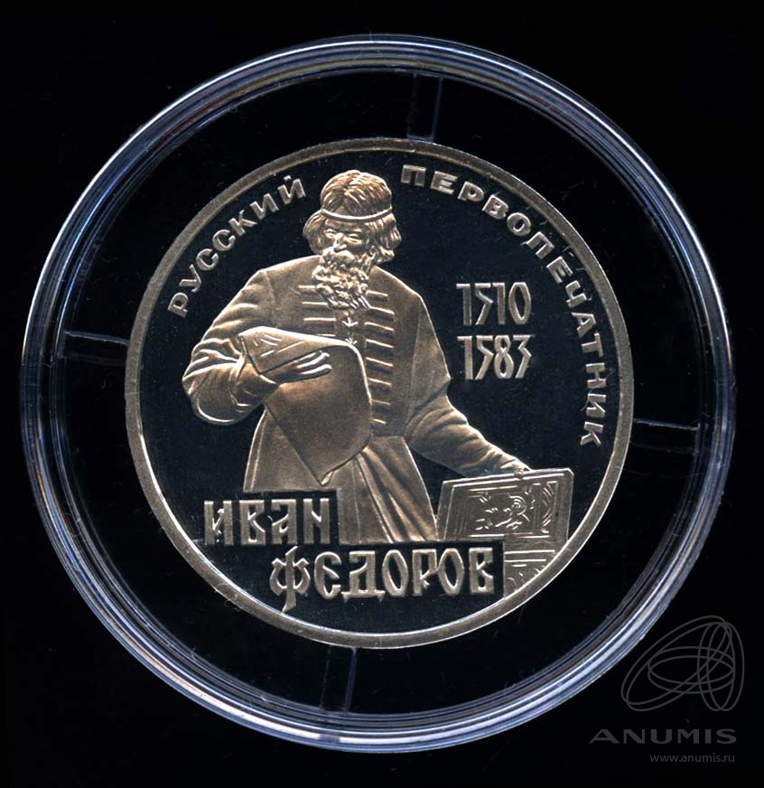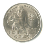Юбилейная монета: 1 рубль 1983 года «400 лет со дня смерти первопечатника Ивана Федорова». Юбилейные 1 рубль 1965 — 1991 гг. Союз Советских Социалистических Республик: СССР поздний (1961 — 1991). Медь-никель, 13 г, ø 31 мм, Гурт: Надпись. Тираж: 2000000/35000 шт. Серия: Выдающиеся личности.