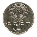 В верхней части изображение Государственного герба Союза Советских Социалистических Республик, под ним надписи: «СССР», в две строки — «1 РУБЛЬ» (слово «РУБЛЬ» расположено полукругом), обозначающая достоинство монеты, и «1991», обозначающая год чеканки. По окружности выступающий кант. Изображение и надписи рельефные.