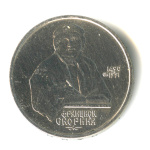 Юбилейная монета: 1 рубль 1991 года «550 лет со дня рождения поэта Алишера Навои. Ошибка в годе. Дата 1990 вместо 1991». Юбилейные 1 рубль 1965 — 1991 гг. Союз Советских Социалистических Республик: СССР поздний (1961 — 1991). Медь-никель, 13 г, ø 31 мм, Гурт: Надпись. Тираж: 3000000/400000 шт. Серия: Выдающиеся личности.