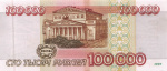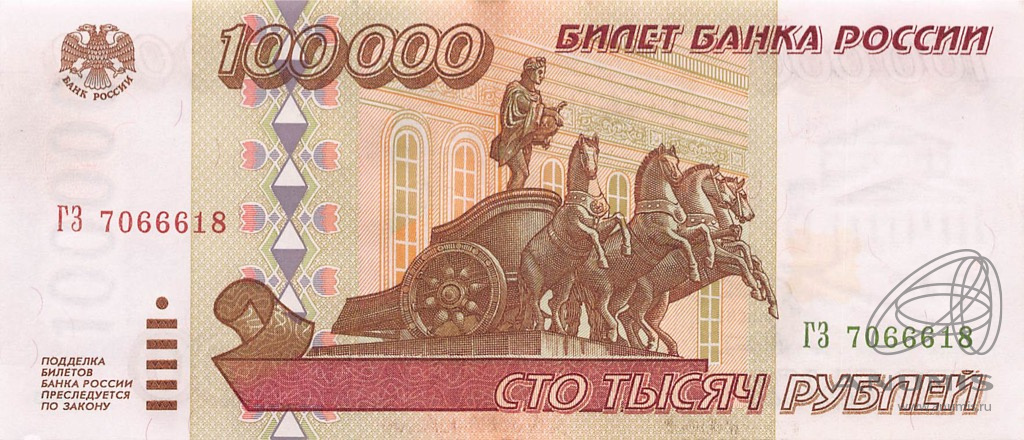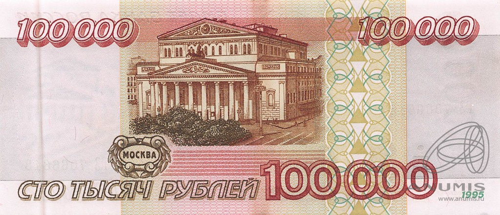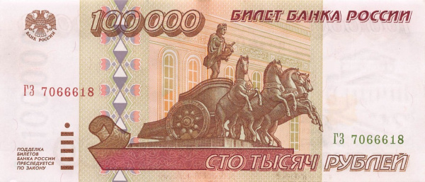 Банкнота регулярного выпуска: 100000 рублей 1995 года. Билеты Банка России 1995 г. Российская Федерация: Банк России (1992 — 1996).