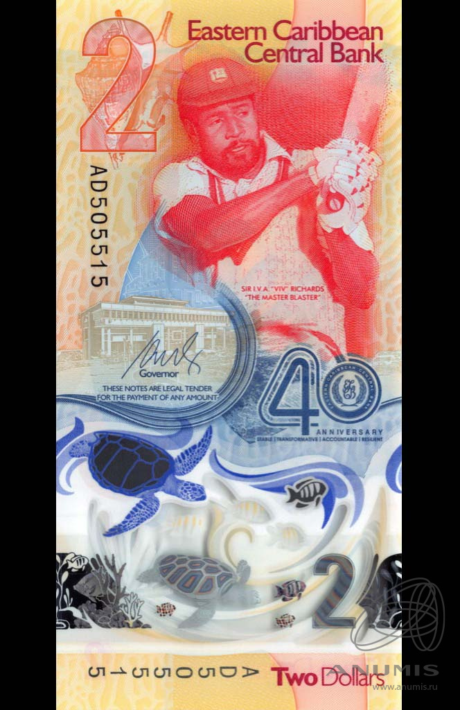 Сторона 1: Раковина, здание Восточно-Карибского центрального банка (Бастер, Сент-Китс) Сэр Айзек Вивиан «Вив» Александр Ричардс («Мастер бластера») с крикетной битой в руках