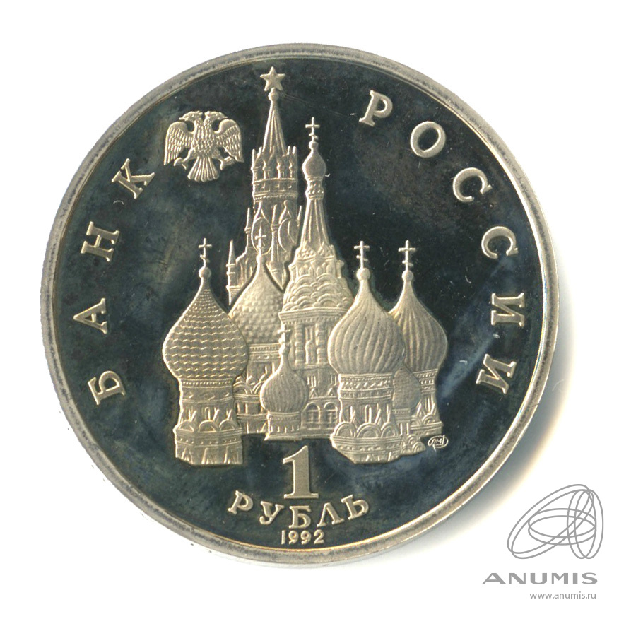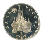 в центре диска — рельефное изображение куполов собора Покрова на Рву на Красной площади и Спасской башни Московского кремля, слева вверху — двуглавый орёл с опущенными крыльями, под собором справа — товарный знак монетного двора, внизу в центре в три строки — номинал и год выпуска: «1 РУБЛЬ 1992», вдоль канта по окружности — надписи, слева: «БАНК», справа: «РОССИИ».