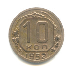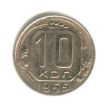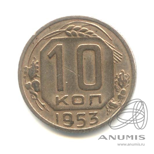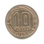 Монета регулярного выпуска: 10 копеек 1953 года «Венок 16 лент». 10 копеек 1947 — 1957 гг. Союз Советских Социалистических Республик: СССР ранний (1924 — 1958). Медь-никель, 2 г, ø 17 мм, Гурт: Рубчатый.
