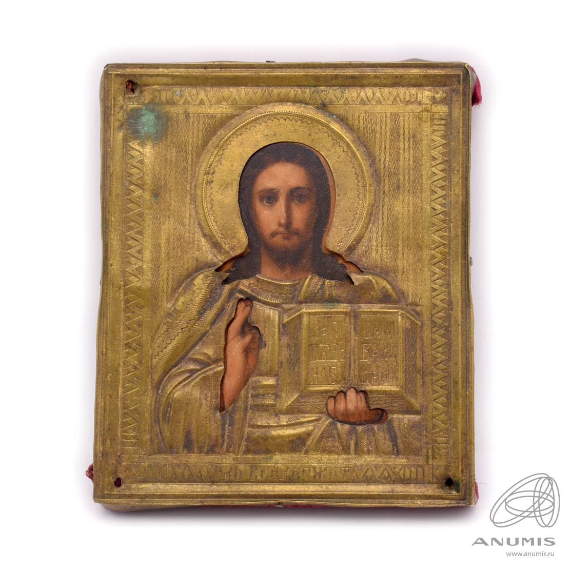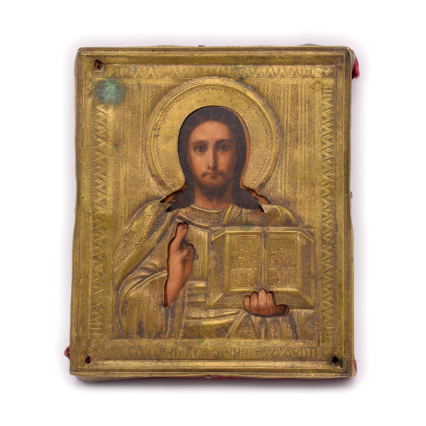 Икона «Господь Вседержитель (Спас Вседержитель)» в металлическом окладе. Дерево, хромолитография с лаком (?), латунь. Размер 11,5×13,5 см